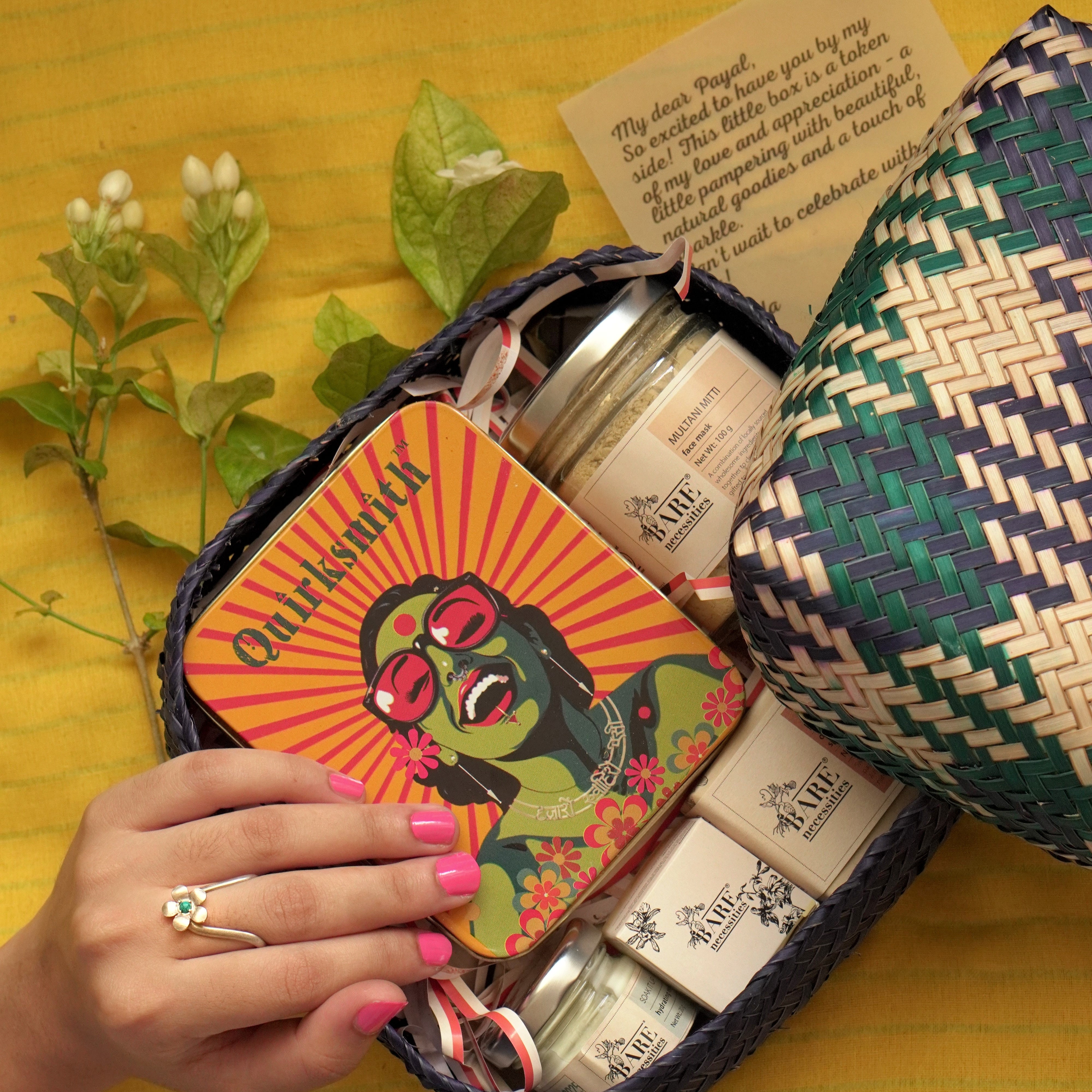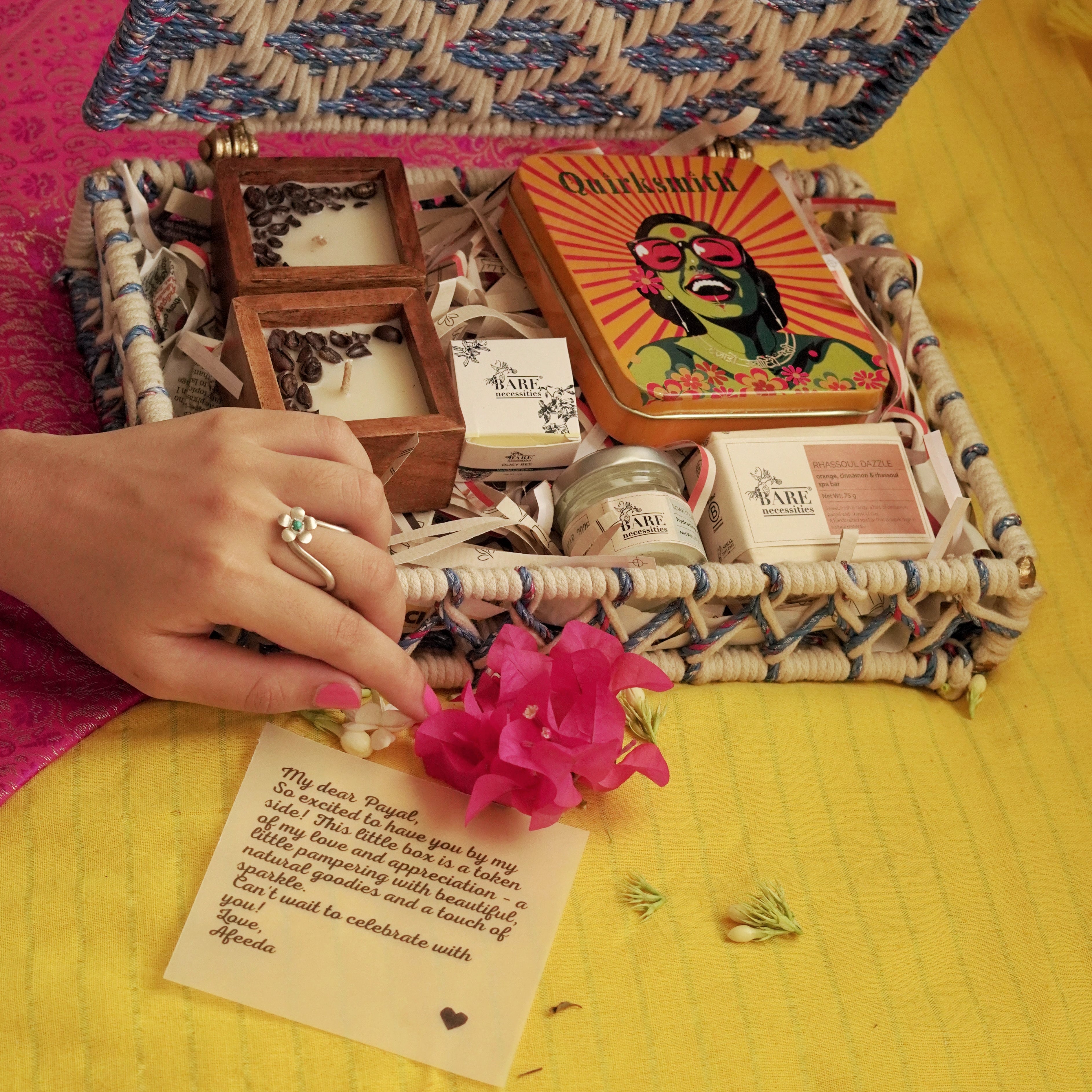A hug in gift form — with the Floral Heirloom Ring (or any jewelry piece of your choice), a self-care kit with a spa bar, moisturizer, softening lip balm, and Multani Mitti for a natural glow, two warm candles — all wrapped in a handcrafted gift box made from upcycled plastic and cotton. Built to last, like your bond.