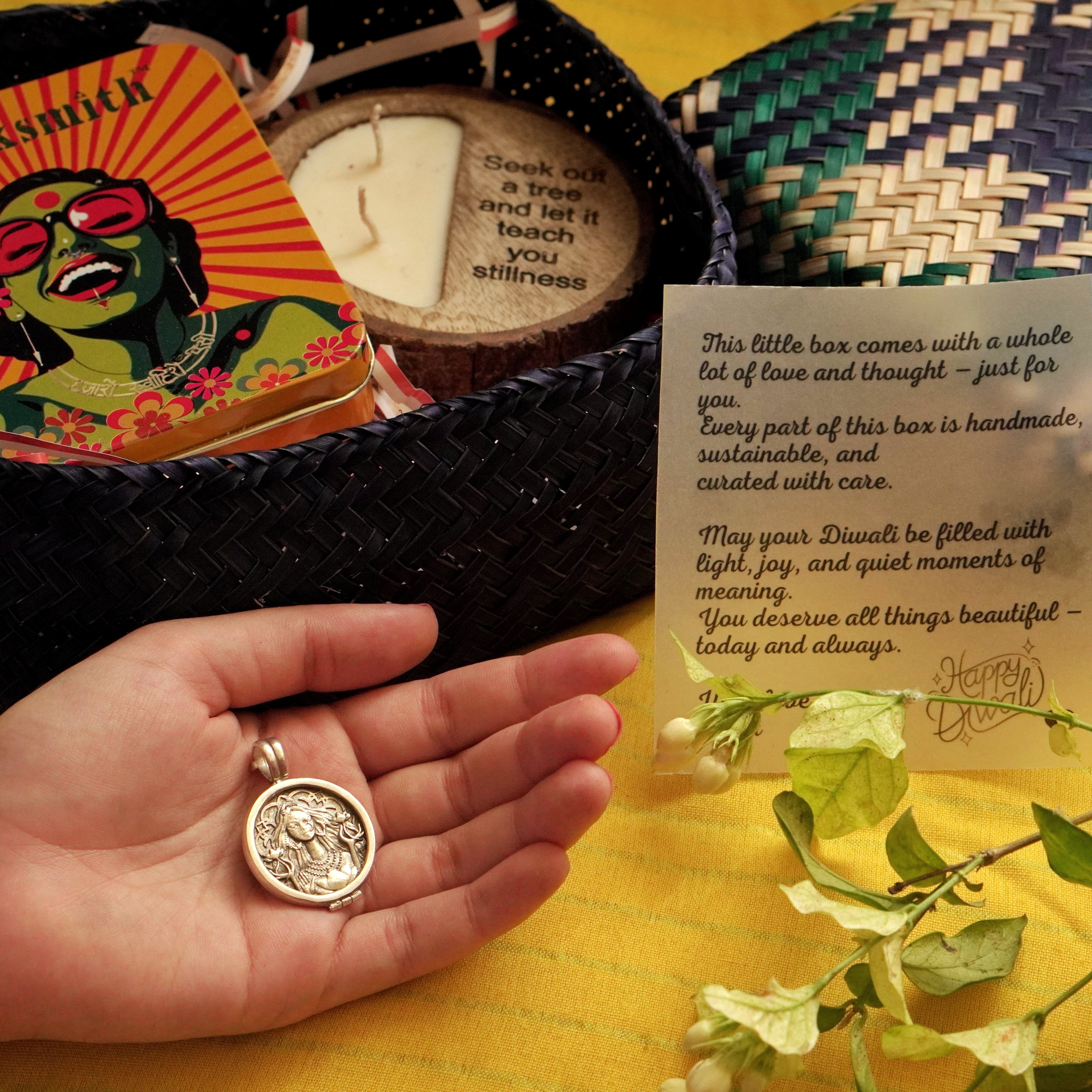 For the ones who light up your life, year after year. A thoughtful Diwali gift wrapped in warmth — with a Lakshmi Coin Pendant, a soft-glow candle, and a handcrafted Kadam Haat box — woven from sitalpati, dyed with azo-free colours, and made to gently return to the earth.