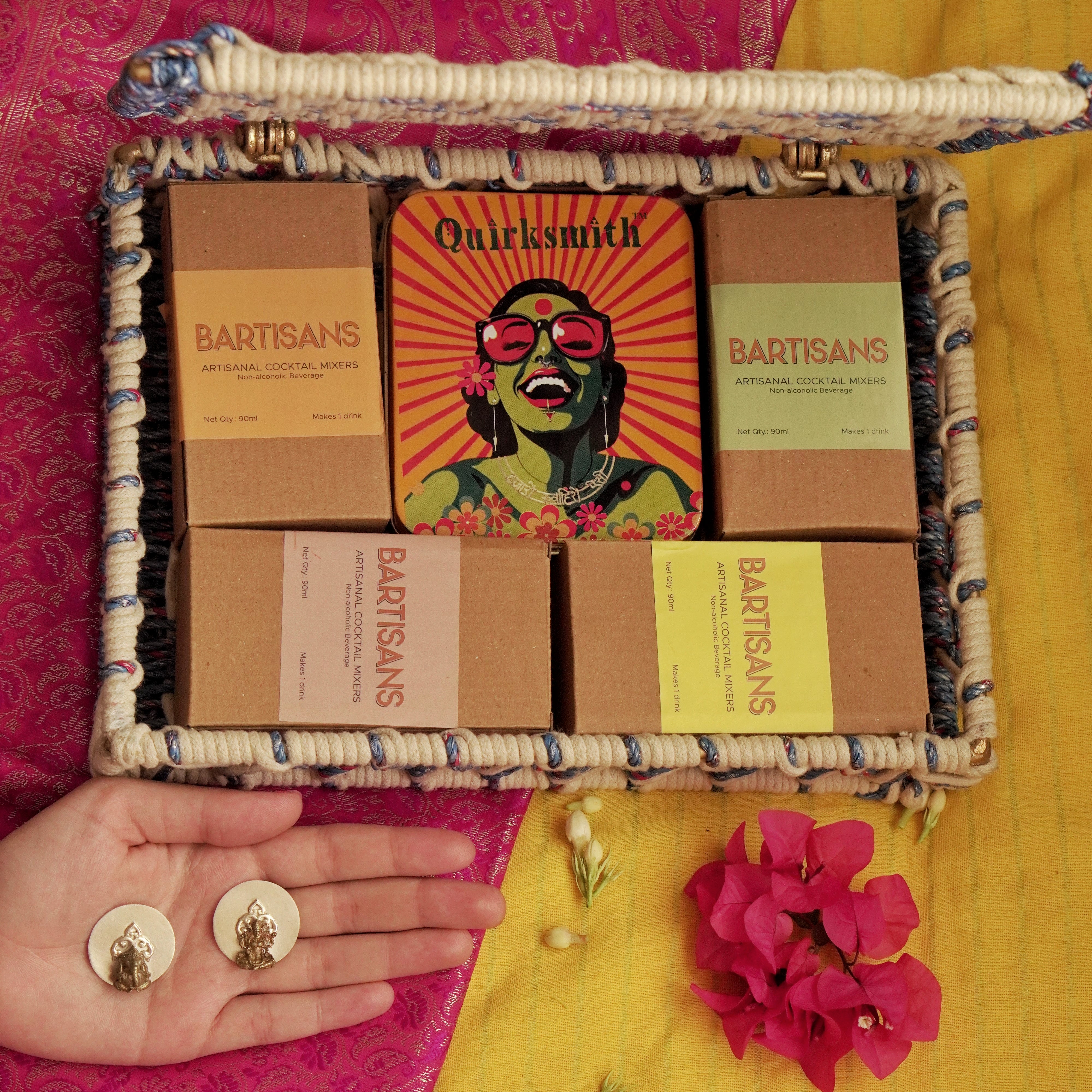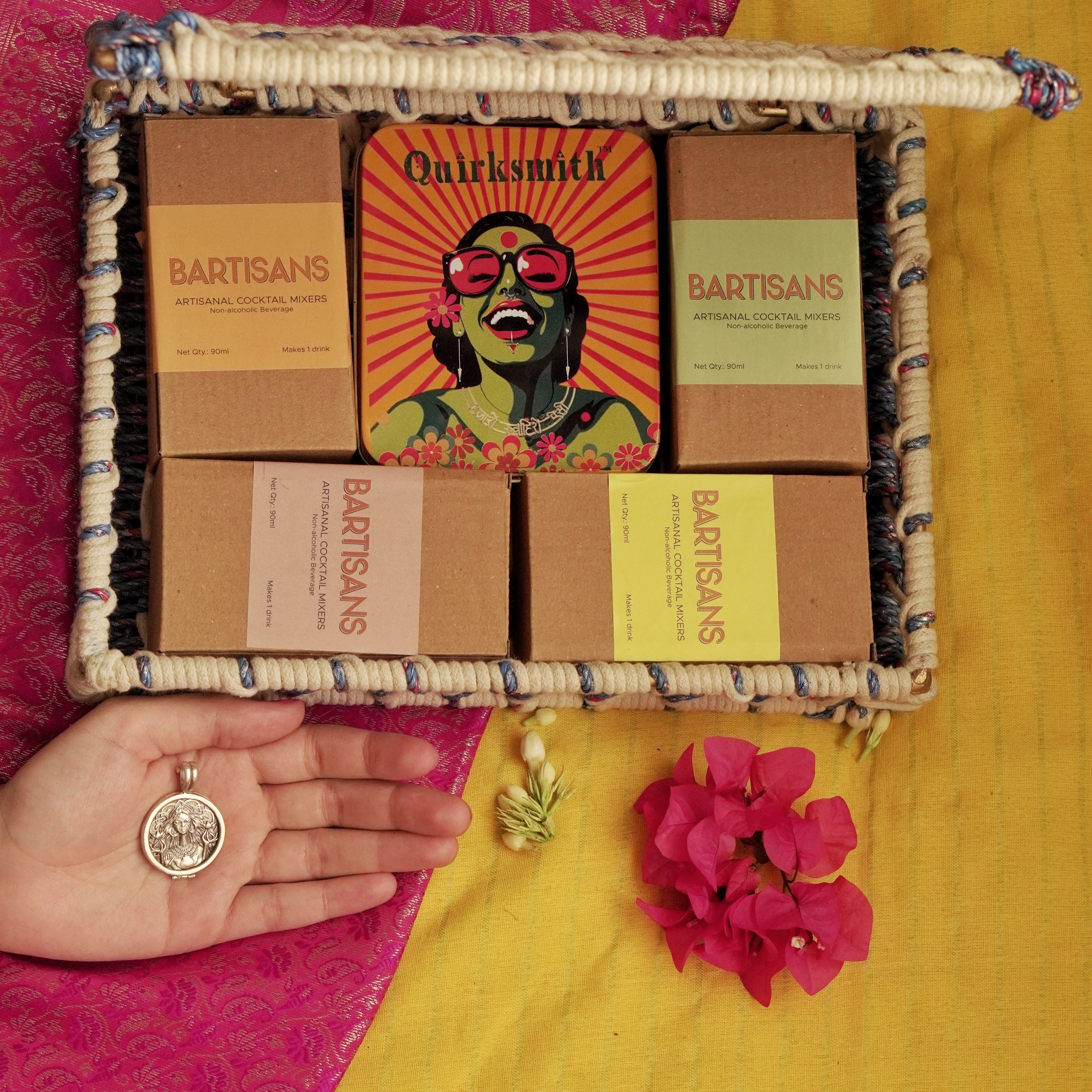 For the one who turns every gathering into a celebration. Raise a glass to love, light, and little luxuries — with Bartisans cocktail mixers, a Lakshmi Coin Pendant for luck, and the elegance of a handcrafted gift box made with upcycled plastic and cotton ropes.