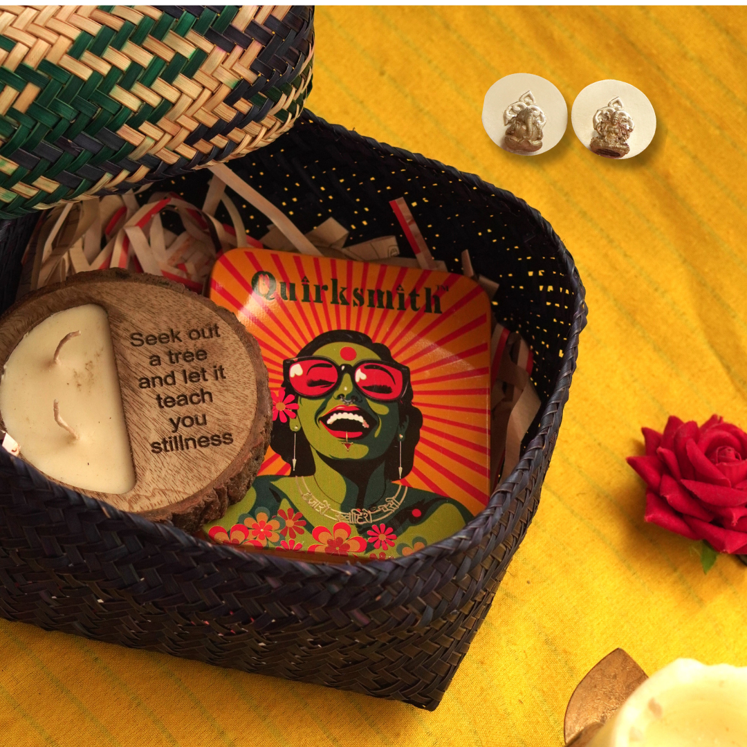 For the one whose faith anchors your festive chaos. Includes Lakshmi & Ganesh Murti Pendants, a warm candle, and a biodegradable gift box — lovingly woven from sitalpati and dyed with azo-free colours. Earthy, elegant, and full of blessings.