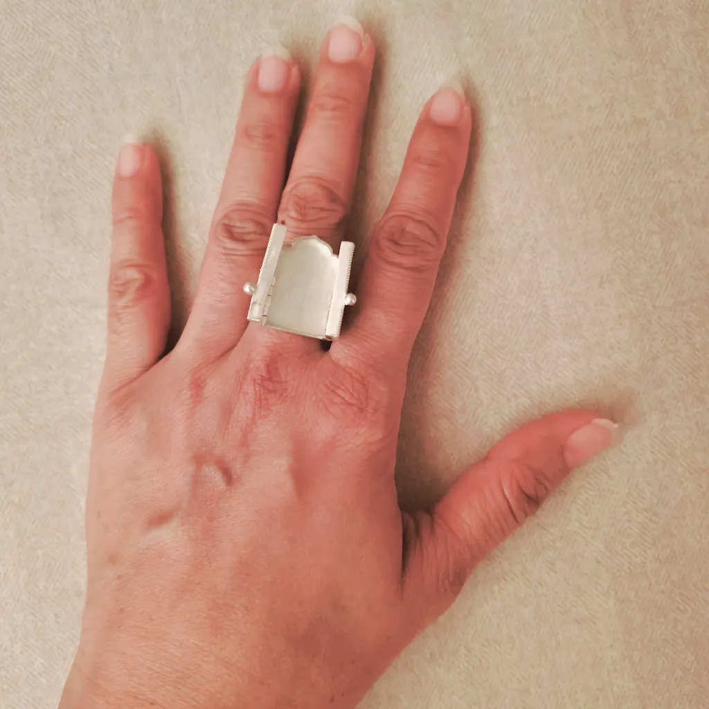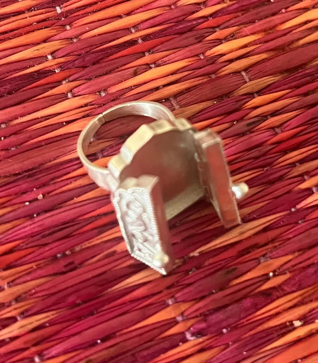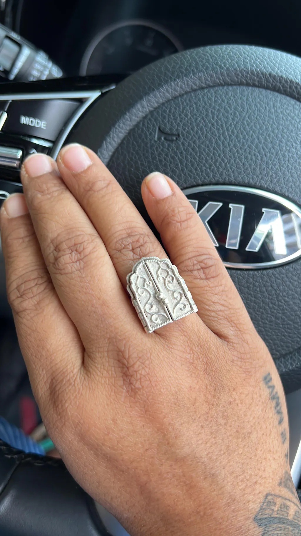 Unlock your story with the Darwaaza Ring, a masterpiece inspired by the mechanical beauty of old Indian architectural doors. Crafted in sterling silver, this ring features a functional door motif that can be personalized with your own engraving, inviting you to carry your cherished memories with style and grace.