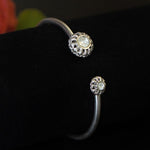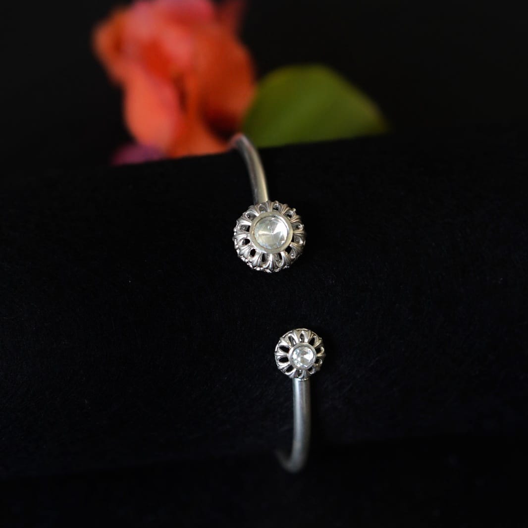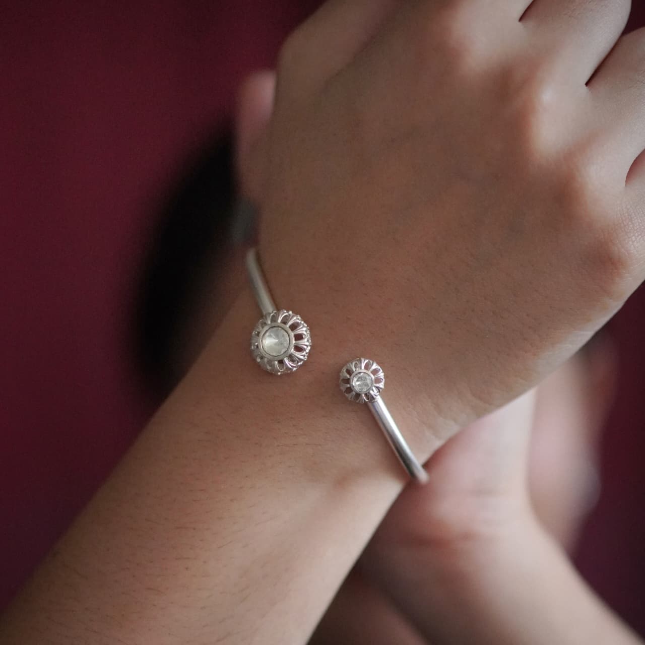 Handcrafted silver Kada with two bright flower details – a bold motif and its mini twin for a fresh, playful look. The kada is sleek, soft, and easy to slip on, making it perfect for both festive and everyday outfits.