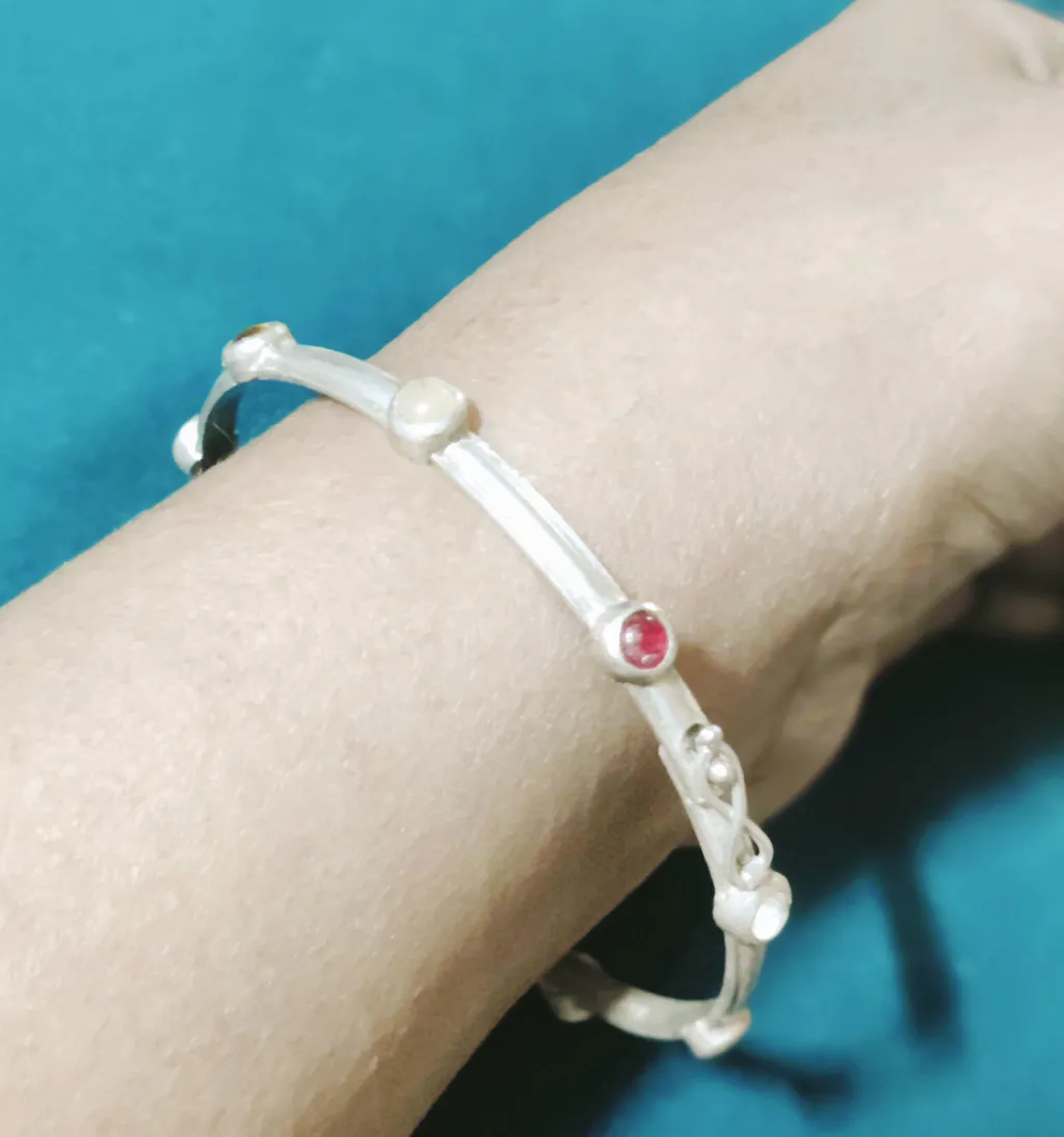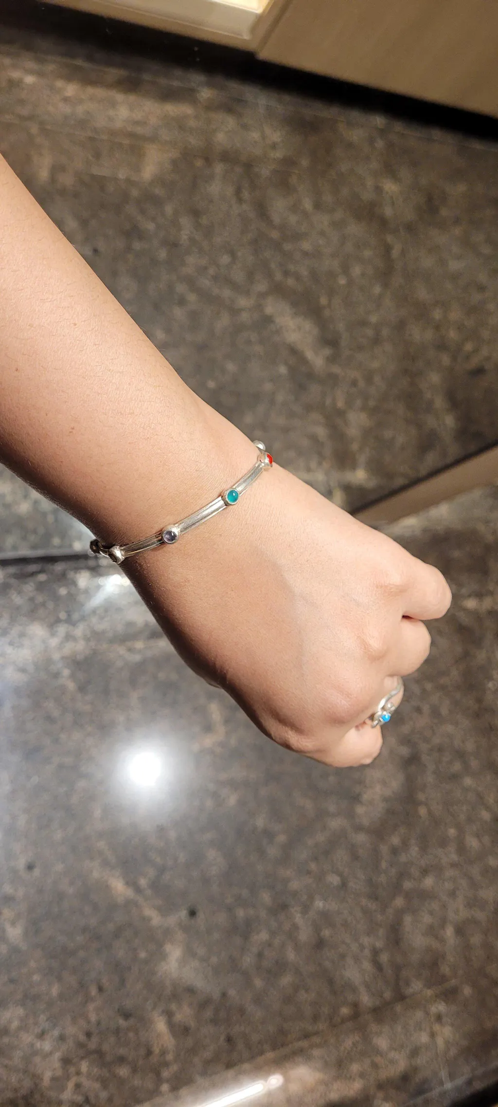 Adorn your wrist with the Navratna Bangle, featuring nine stunning gemstones that symbolize harmony and balance. This statement piece is perfect for any special occasion.