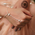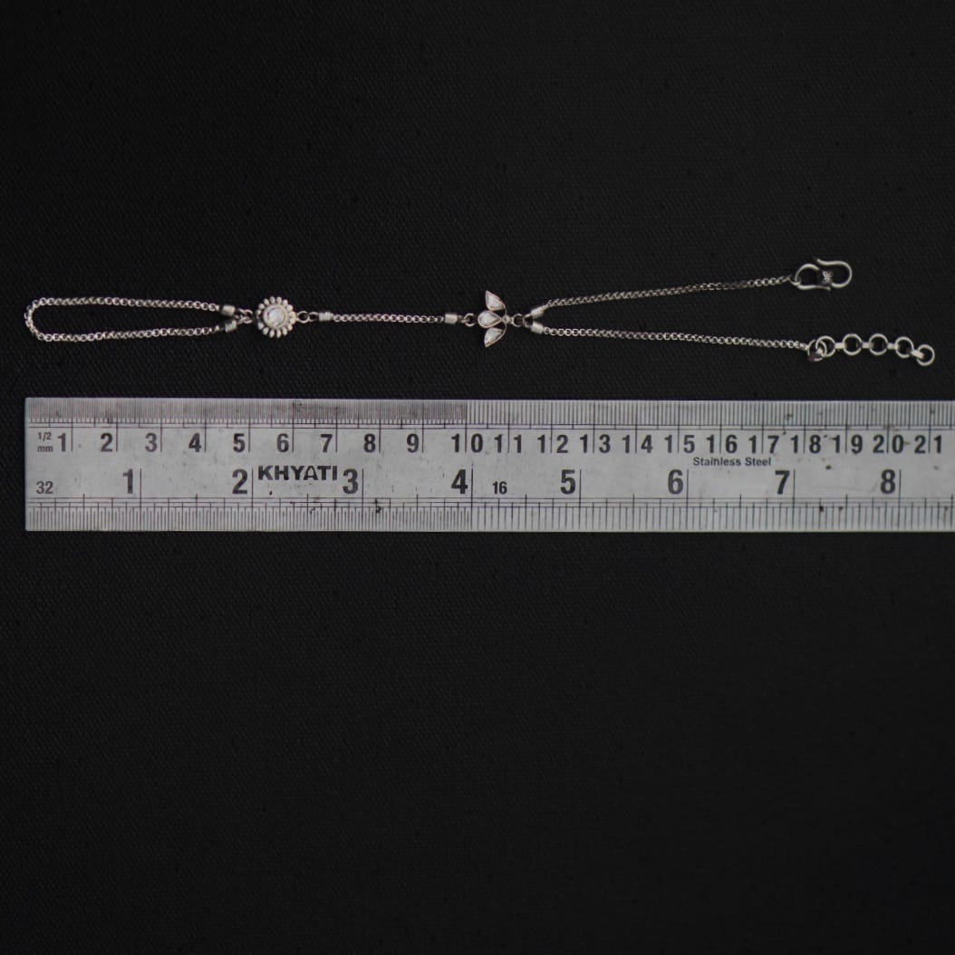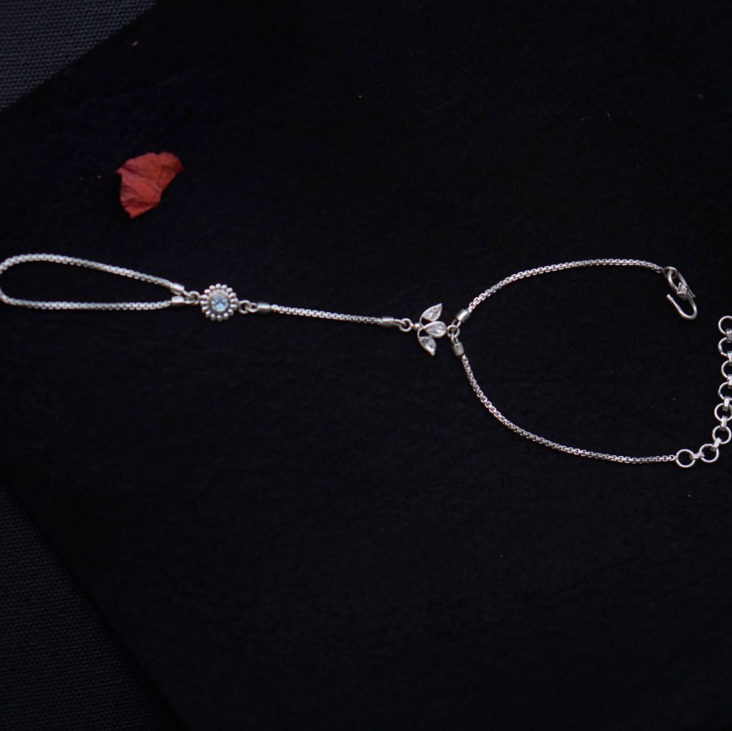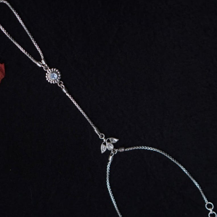A playful silver hand harness with a central flower motif set with sparkling moissanite a lab-grown gem loved for its diamond-like brilliance and eco-friendly appeal. Sleek leaf accents and delicate chains wrap beautifully around your hand, blending tradition with everyday style.