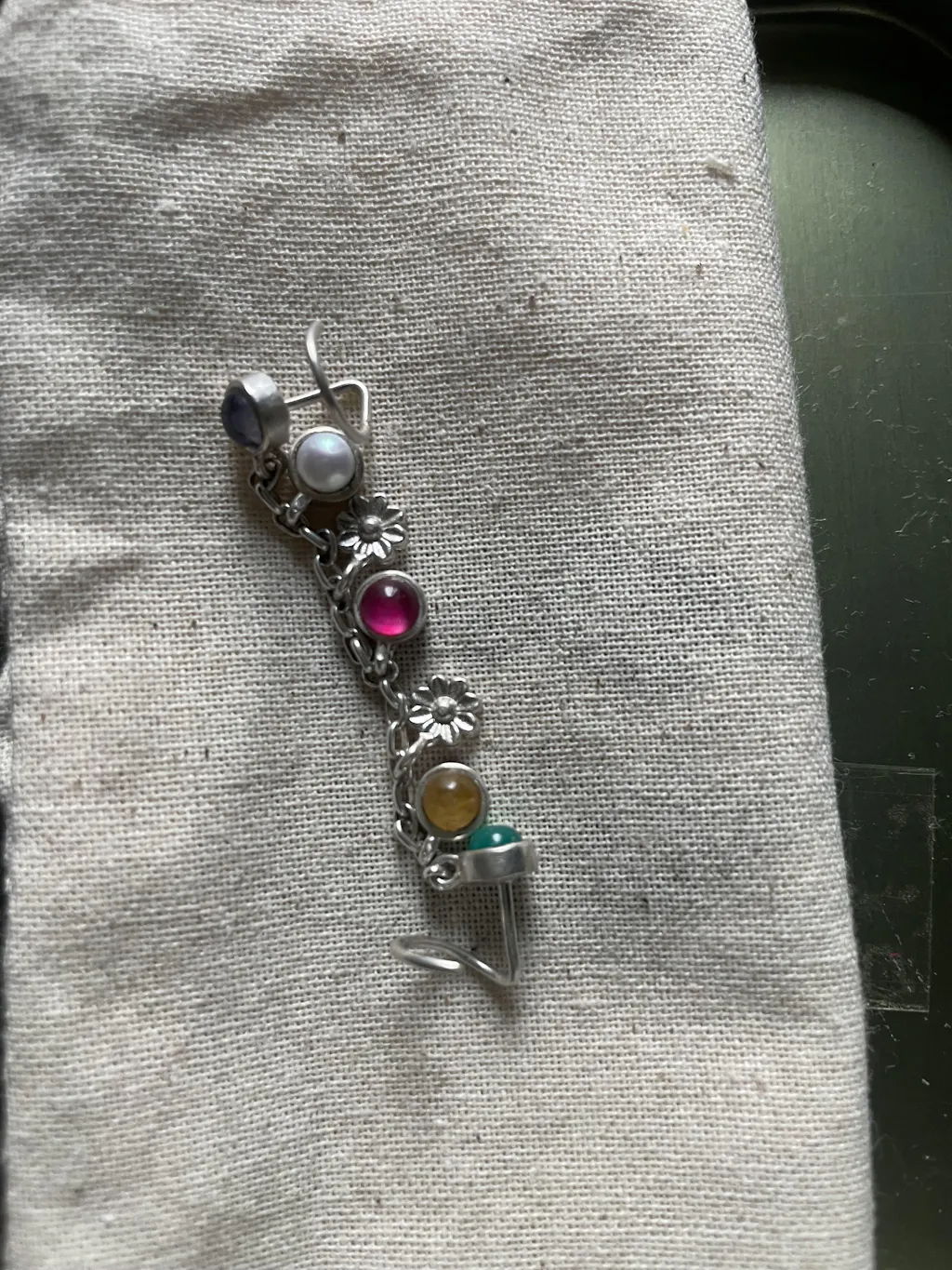 The Rimjhim Earring is a unique design for double piercings, featuring a delicate string adorned with colourful stone charms. This versatile piece can be worn as nosepin and ear accessory.